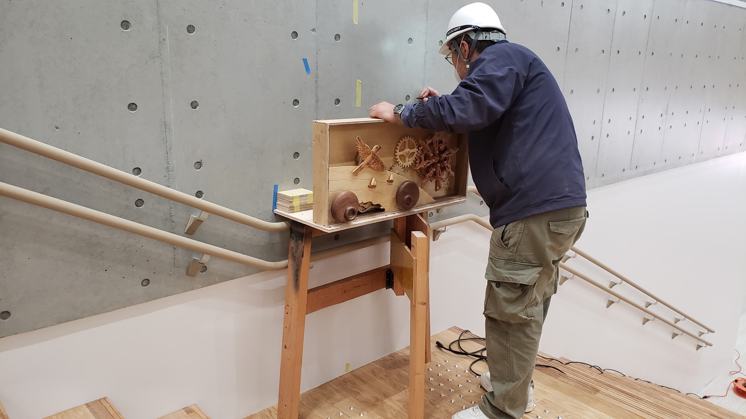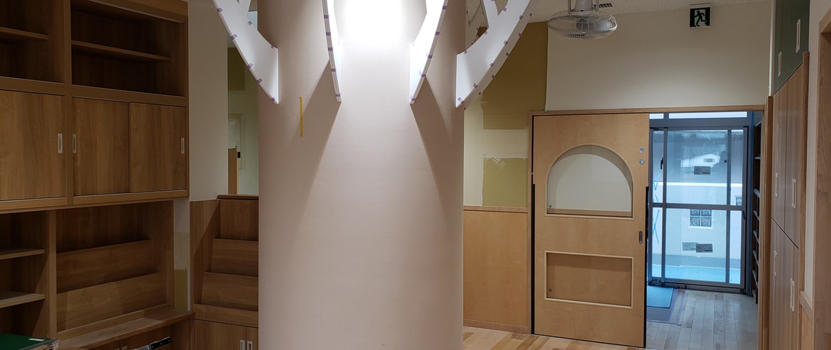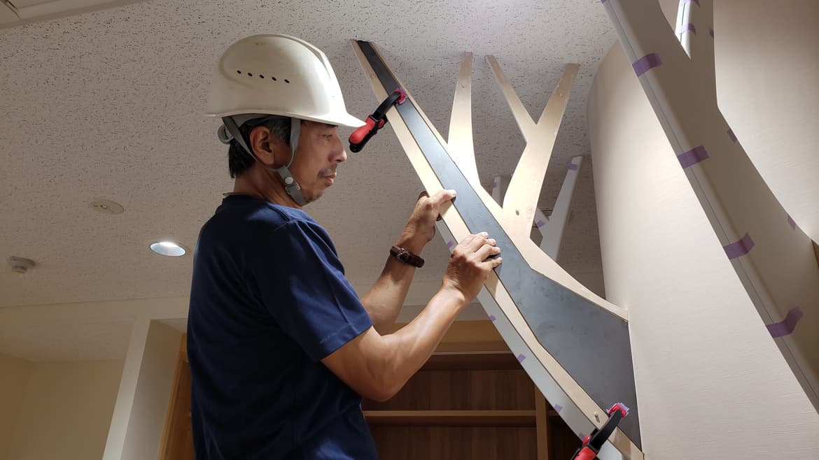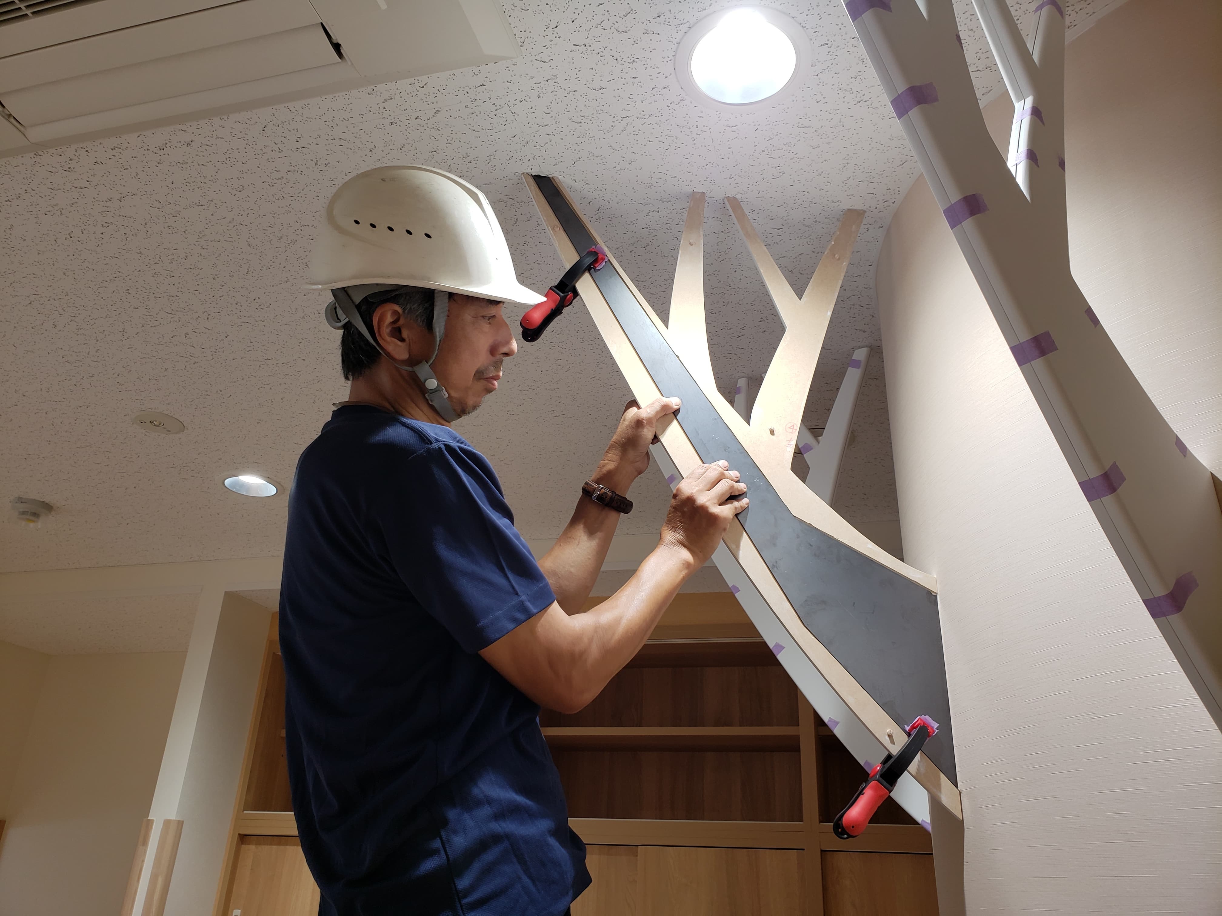 枝は、脱落防止として中に鉄板を仕込み天井と立ち上がり2箇所で補強接合、っ方に合わせたMDF製の枝オブジェを金物の両面からサンドする方法を取りました。
