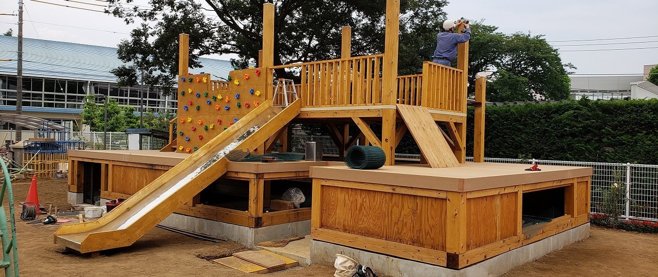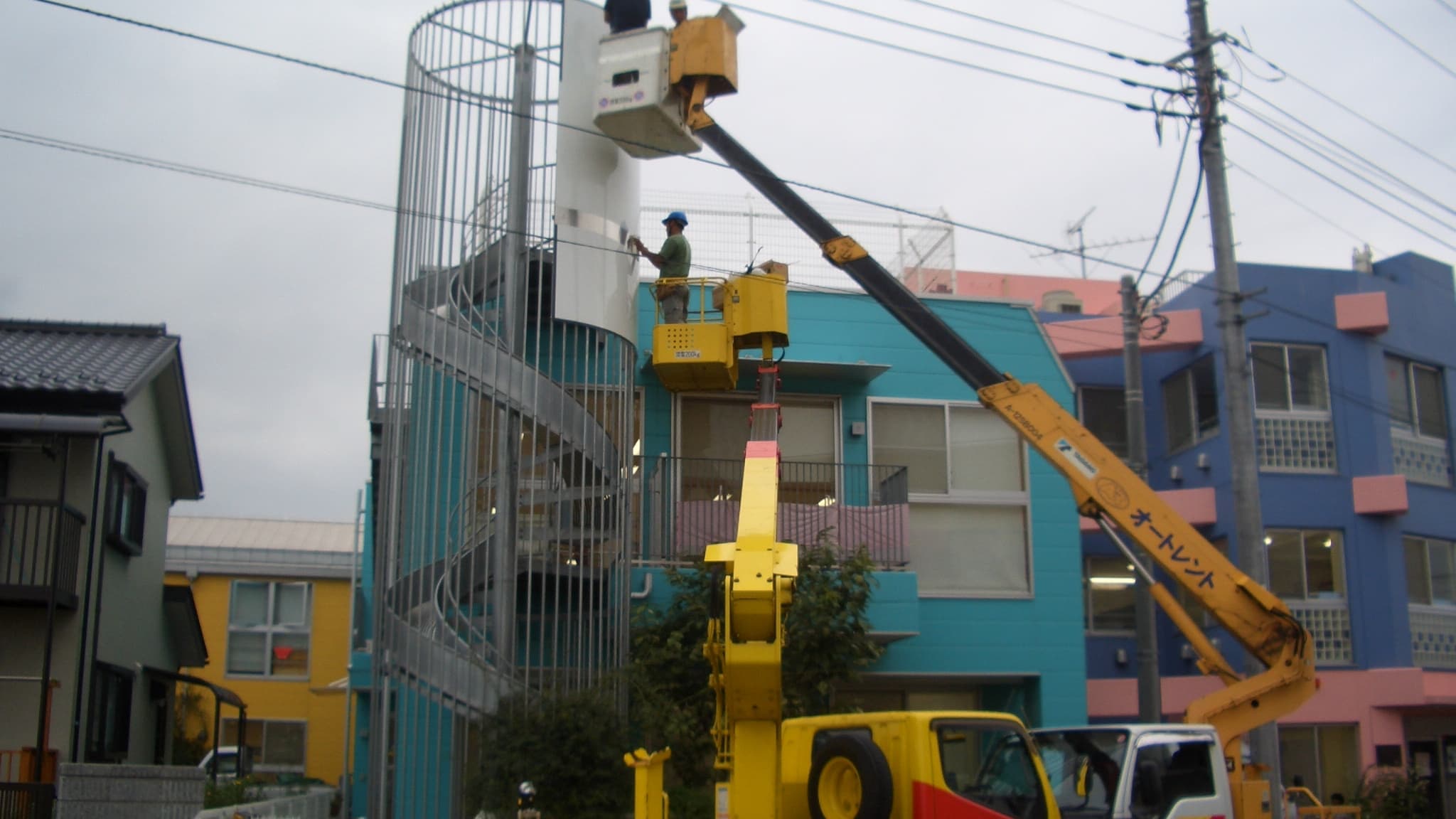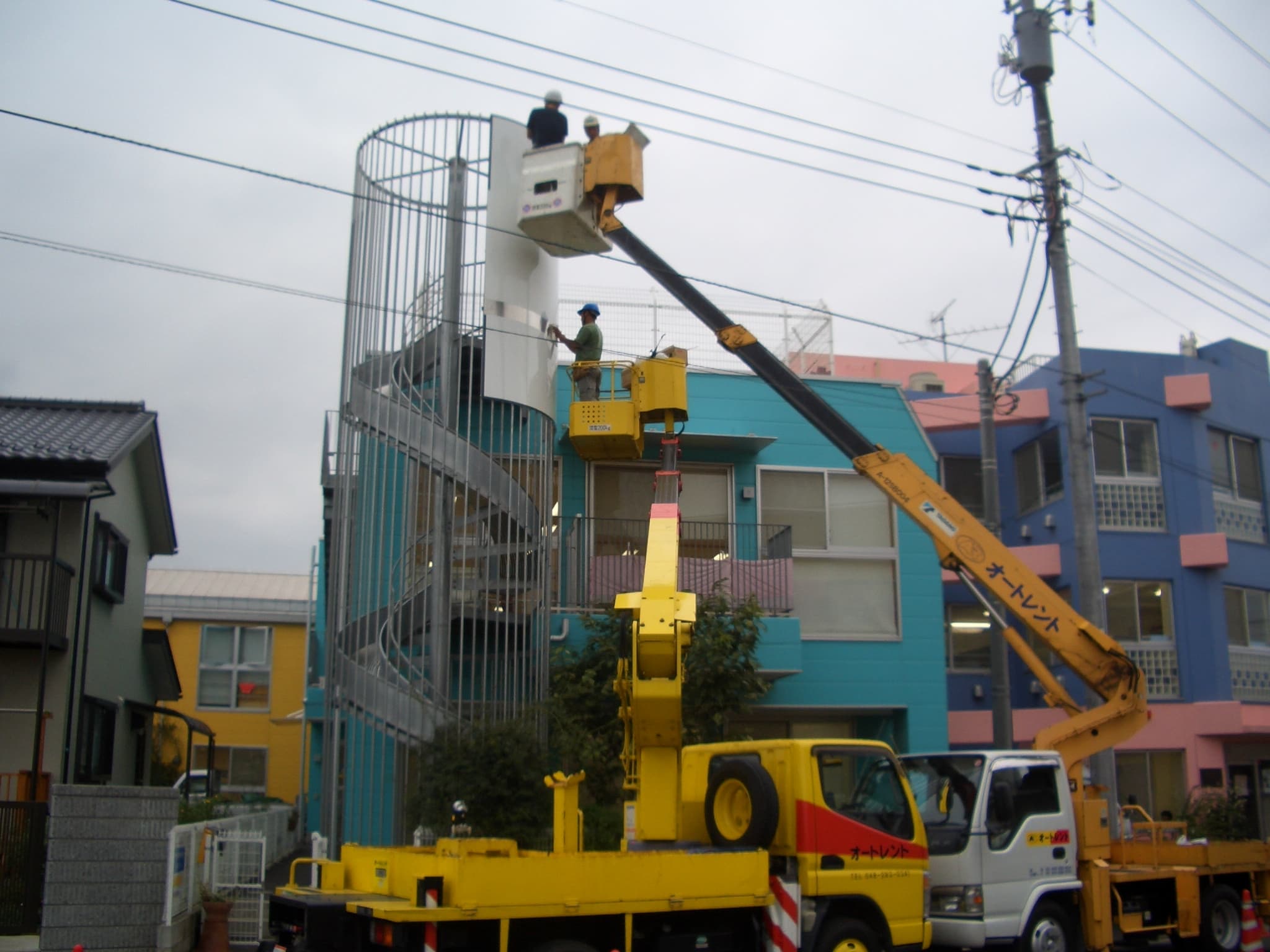 日野市包括支援センター 避難用R型すべり台の手摺に看板を設置 道路側にある設備でとてもに安いため、ここに設置することを提案 施工的には、表示面がR型だったのと舗装丸バイプの縦型囲いだったので、設置方法の金物加工 施工工場との年密な打合せ現場調査で見事1日で完了した物件でした。